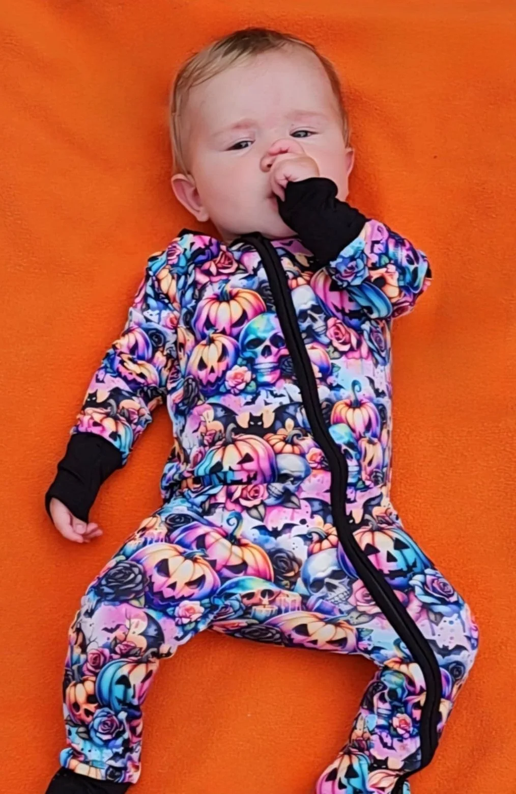 Items are made from 95% bamboo and 5% spandex, so they're super soft and stretchy! Features include fold over cuffs for hands and feet and size 6-12 month and above have grips on the bottom of the foot cuffs.